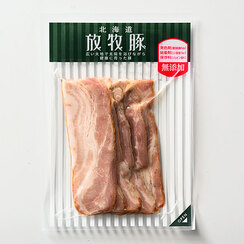 北海道の広大な農場で放牧し、ストレスもなく自然体で育った豚のベーコンです。 豚肉の旨味を最大限に引き出し、子供から年配の方まで安心して食べられる味に仕上げました。