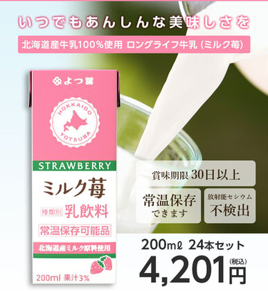 【送料無料】よつ葉 北海道産 ロングライフ牛乳(ミルク苺) 200ml×24本 放射能検査済み