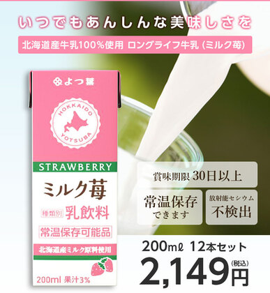 よつ葉 北海道産 ロングライフ牛乳(ミルク苺) 200ml×12本 放射能検査済み